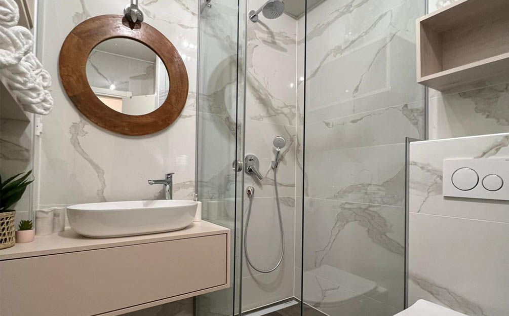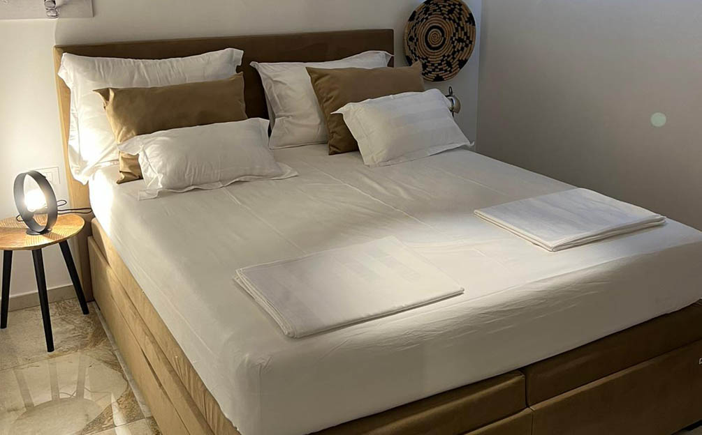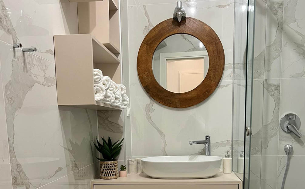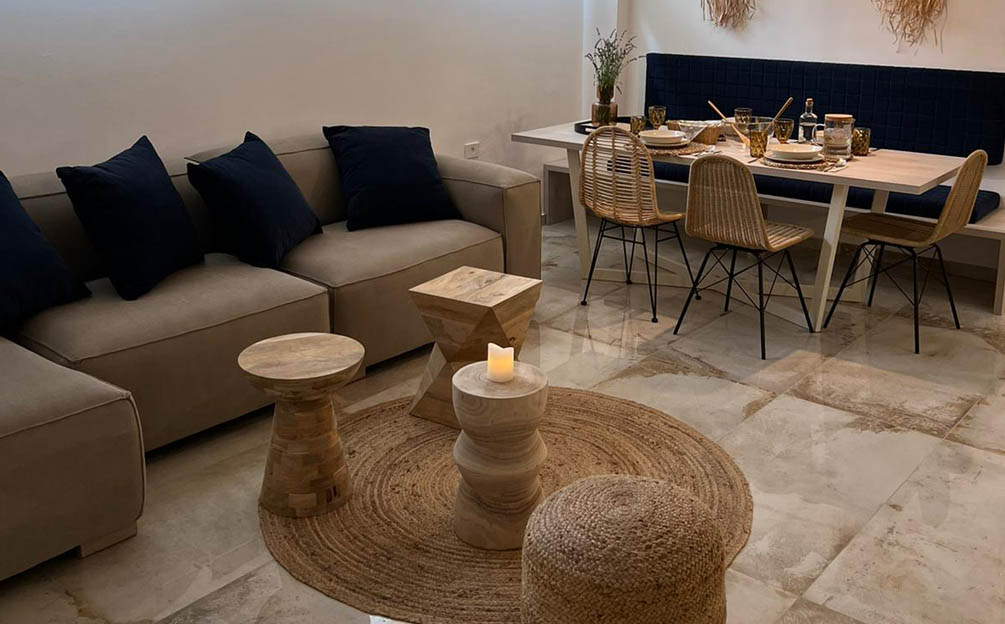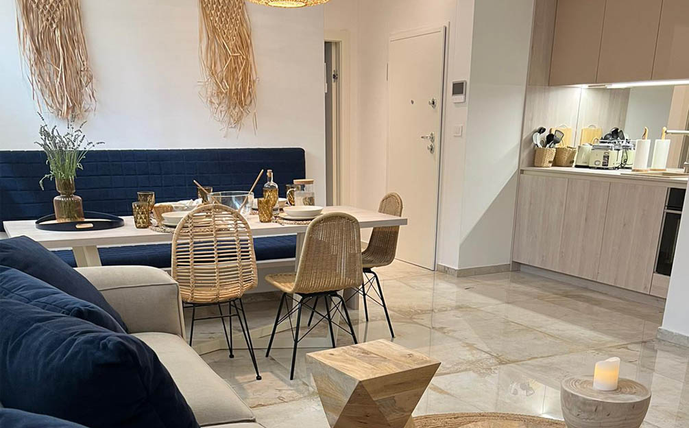 Apartman je smješten u suterenu zgrade, te nema balkon ni terasu. Moderno namješten u mediteranskom stilu.