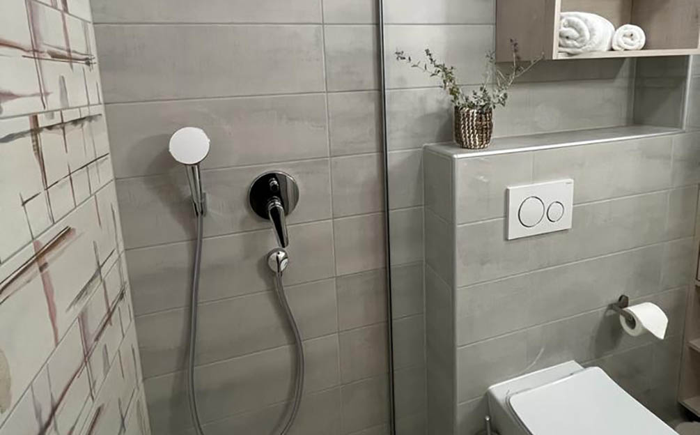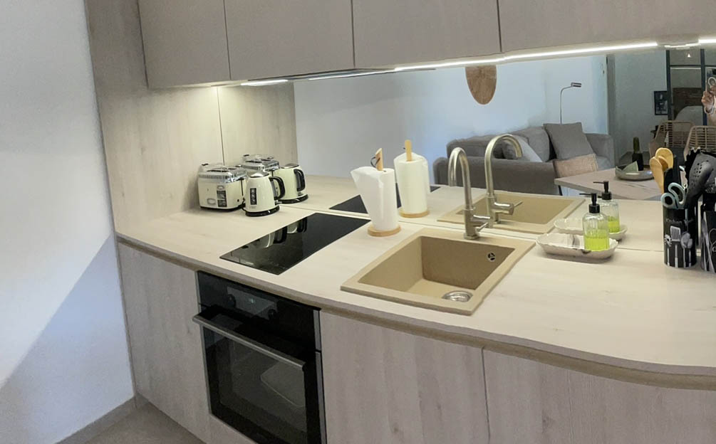 Ispred apartmana se nalazi ugodna terasa sa stolom i foteljama za sjedenje i tendom. Apartman je u potpunosti opremljen. U kuhinji se nalazi štednjak sa pećnicom, kuhalo za vodu, kuhalo za kavu, toster, glačalo sa stolom za glačanje, hladnjak sa zamrzivačem, mašina za sude. U kupaonici je tuš kabina te fen za kosu. Sušilo za rublje je ispred apartmana na terasi.